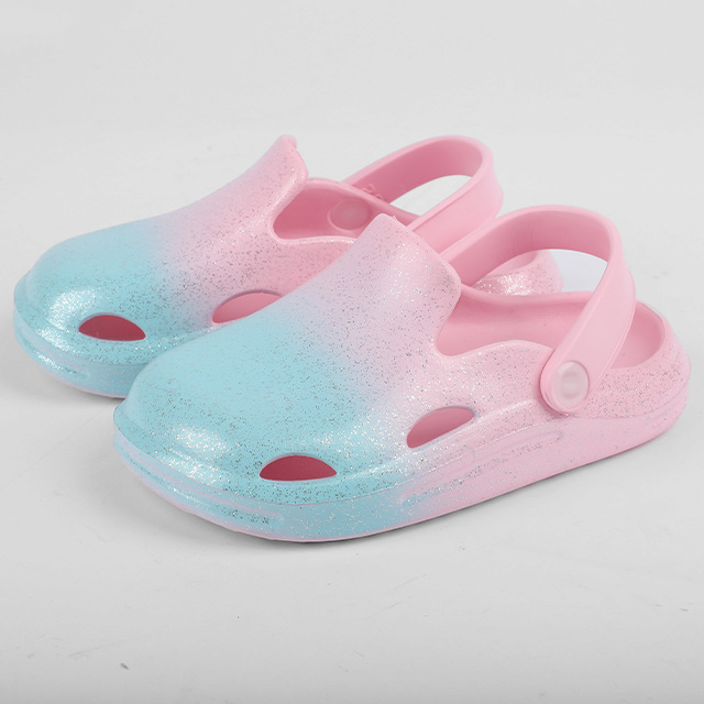 This girls’ garden clog is designed with a soft pink-to-blue gradient colorway, creating a gentle, dreamy visual effect that feels playful, magical, and perfectly suited for summer. The smooth transition between pastel pink and fresh blue gives the shoe a light, airy appearance, while the subtle glitter finish adds a touch of sparkle that catches the light beautifully without feeling overwhelming. This combination creates a charming look that appeals to young girls who love sweet, colorful, and imaginative styles.